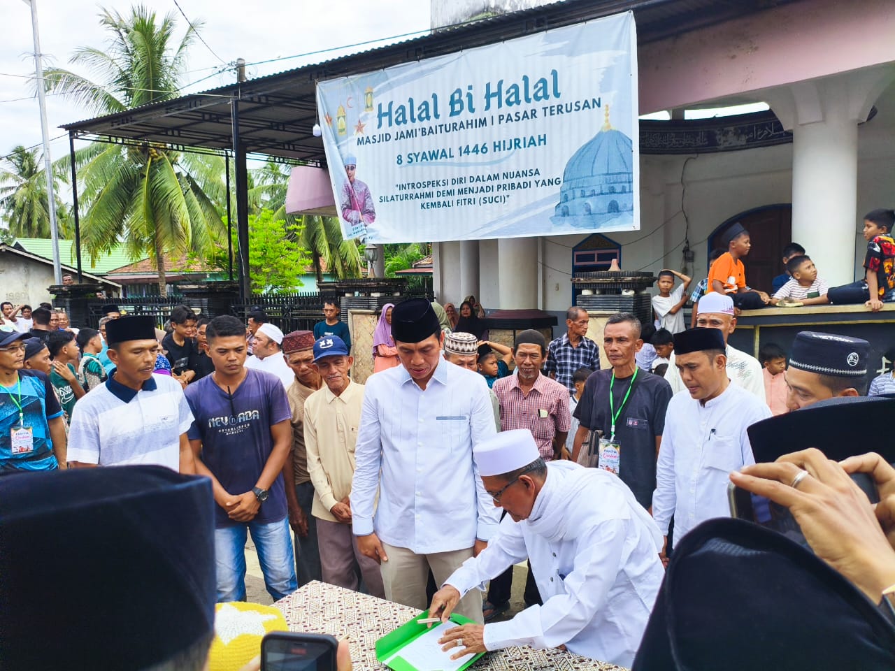 Sapi Qurban ini diserahkan kepada Imam Masjid Jami’ Baiturrahim, H. Imran, HAB, didampingi pengurus masjid, panitia qurban, serta masyarakat, sekaligus menandatangani berita acara serah terima.