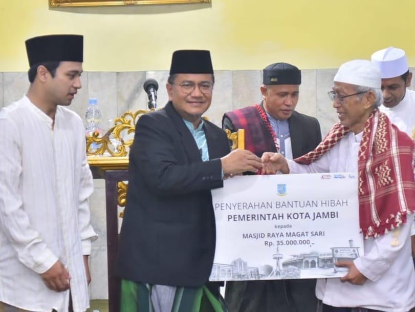 SIGINJAI99.COM, JAMBI – Pemkot Jambi menyalurkan hibah Rp35 juta untuk Masjid Raya Magatsari. Penyerahan dilakukan langsung oleh Wali Kota Maulana dalam acara peringatan Maulid Nabi Muhammad SAW 1447 H/2025 M, Kamis malam (4/9).